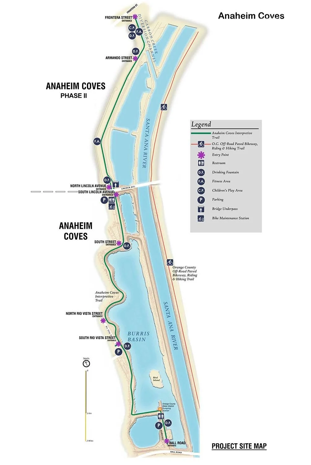 The Anaheim Coves is located along the Santa Ana River that displays a beautiful 26-acre nature park. The site offers 2.5 miles of multi-use areas.